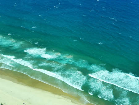 Landscape of the crystal clear sea, blue cloudy sky, sandy beach in the Gold Coast Australia Queensland, top view. Photo of the beach in the sunny day.