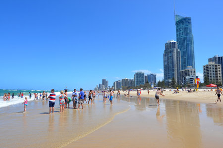 SURFERS PARADISE - NOV 08 2014:Visitors on main beach in Surfers Paradise.It one of Australia's iconic coastal tourist destinations, drawing about 10 million tourists every year from all over the world.