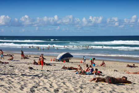 GOLD COAST, AUSTRALIA - MARCH 23, 2008: People visit the beach in Surfers Paradise, Gold Coast, Australia. With more than 500,000 people, it is the 6th most populous area in Australia.