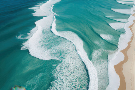 This image captures an aerial perspective of dynamic ocean waves crashing onto a pristine sandy beach, showcasing clear, rhythmic patterns and vivid colors that evoke a sense of tranquility and natural beauty encapsulated within the seascape.