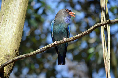 Portrait of Dusky Broadbill(Corydon Sumatranus) opening her mount in nature at Kaengkracharn national park,Thailand