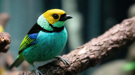 A vibrant Golden-Headed Tanager with striking yellow, turquoise, and black plumage sits on a textured tree branch, showcasing its colorful beauty.