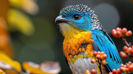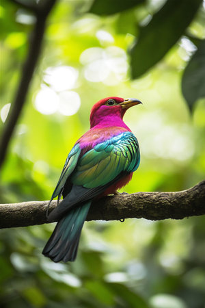 Vibrant tropical bird with colorful plumage sitting on a tree branch in a lush green forest, illuminated by soft natural light.