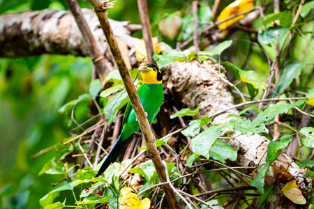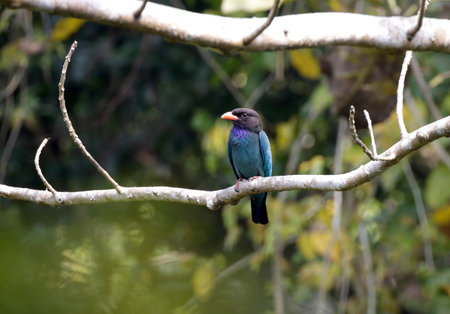 colorful bird long tailed broadbill on tree branch in forest