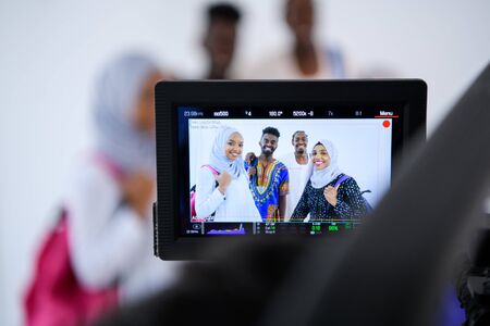 male videographer in white digital studio recording video on professional camera by shooting happy african students standing together against white background girls wearing traidiional sudan muslim hijab fashion