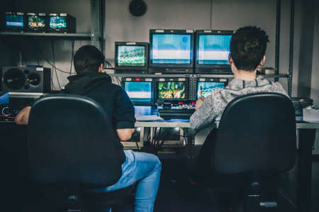 Behind the scene. Film crew in studio for film montage. Analog and digital video editing