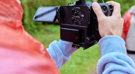 Professional camcorder and hand video operator close-up