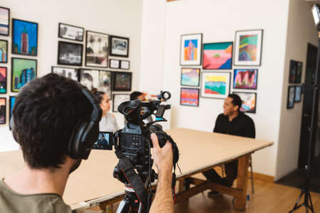 LOS ANGELES, UNITED STATES - Jun 03, 2019: Male cameraman filming video during an interview.