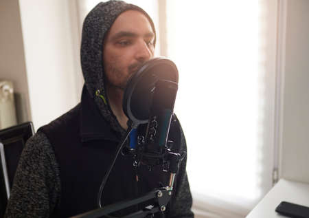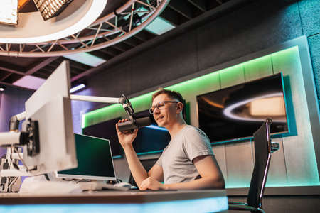 The DJ hosts the program and communicates with the audience on air at the radio station. The announcer reads the news. A male radio host speaks into a microphone and records a podcast