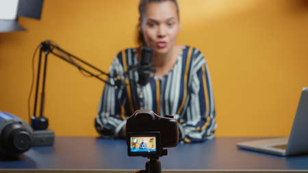 Selective focus on camera while social media star records an new podcast episode in her professional studio. Content creator new media influencer recording for internet web online subscribers audience