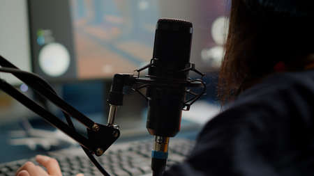 Close-up of pro streamer woman talking at microphone during virual video games tournament. Cyber gamer streaming playing online video games using RGB keyboard mouse late at night in gaming studio