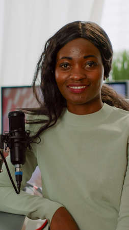 African american blogger recording video on camera for channel in studio. Black vlogger using modern equipment and smartphone to record social media podcast. Influencer vlogging