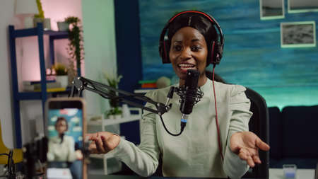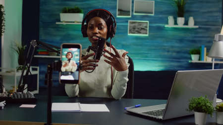 Focused shot on smartphone recording african blogger woman talking looking at camera during online podcast. Content creator streaming online broadcast, blogger discussing wearing headphones.