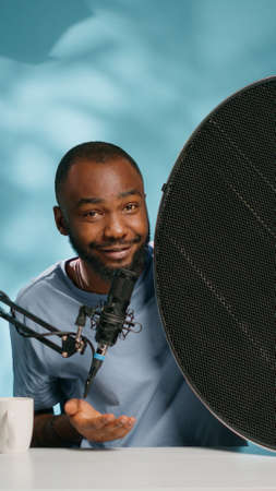 Close up of influencer using microphone to talk on online podcast in studio. Vlogger talking to subscribers while using modern equipment for social media content. Blogger with channel