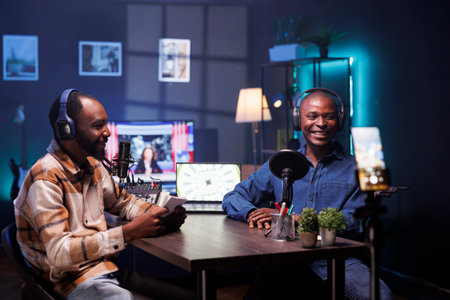 During live debate on vlog channel, happy vloggers utilizing smartphone on a tripod to film podcasts. Joyful men gathered in a studio to record broadcast using a cell phone and discuss world affairs.