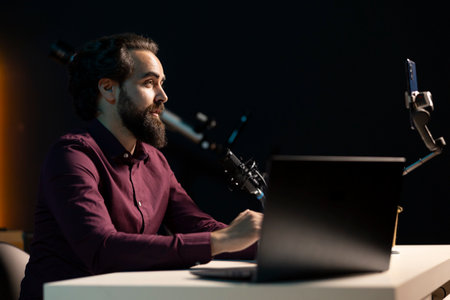 Radio talk show host answering audience questions on laptop while recording video. Creative content creator chatting with public on live chat while speaking on modern microphone.