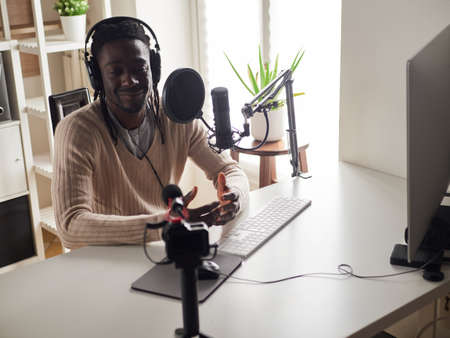 afroamerican happy young male recording audio blog in headphones microphone broadcasting at home ...