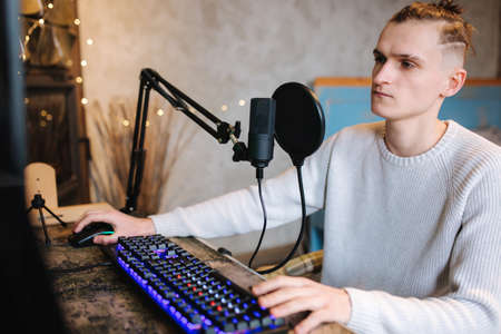 Young man makes a podcast audio recording at home. Man using pc and two professional microphones. Person recording a podcast at home using microphone and computers. Recording online podcast