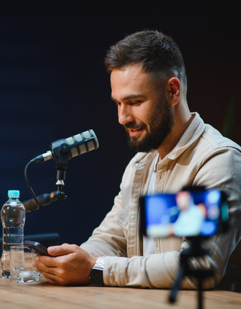 Content creator using professional microphone and smartphone for recording podcast and streaming live video