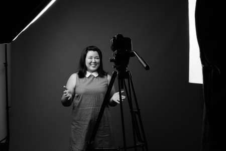 Beautiful overweight Asian woman against gray background