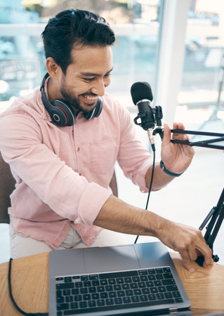 podcaster blogger smiling while broadcasting his live audio podcast in the studio using a microphone