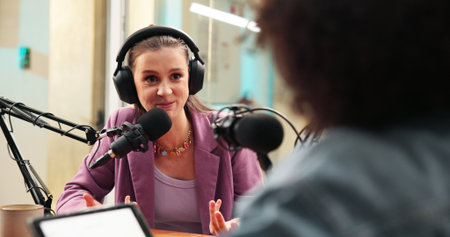 Young woman podcaster in headphones recording content with colleague talking to microphone in broadcast studio together