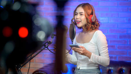 A young smiling female singer wearing headphones with a microphone while recording song in a music studio with colorful lights.