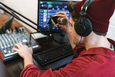 Image of young happy caucasian dj man wearing headphones working at radio station while making podcast recording for online show