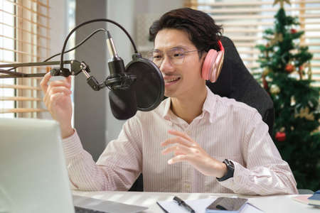 happy asian man is recording a podcast in his studio