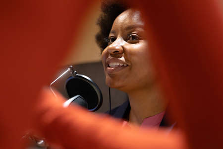 Portrait of african american businesswoman speaking to microphone and smiling. business person recording podcast in a modern office.