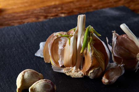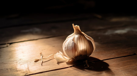 Lifestyle, product shot of opened fresh head of garlic on wooden table. Play of light and shadow. High quality photo