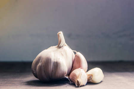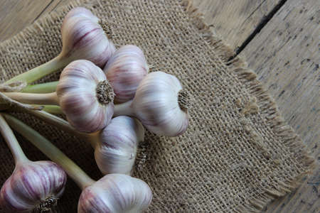 Beautiful white -purple garlic clove on wooden table in the background garlic bulbs