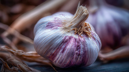 Fresh Garlic Bulb Still Life Shows Purple Streaks and Texture Detail