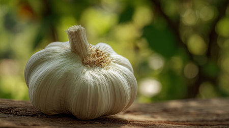 Fresh garlic bulb resting on wood with a nature bokeh background.