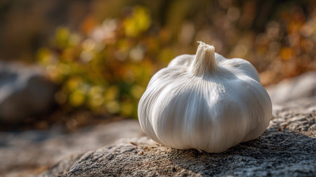 Single garlic bulb sitting naturally on a weathered stone surface outdoors