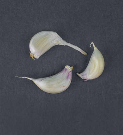 Top view of three peeled white colored small garlic seeds on an isolated dark background