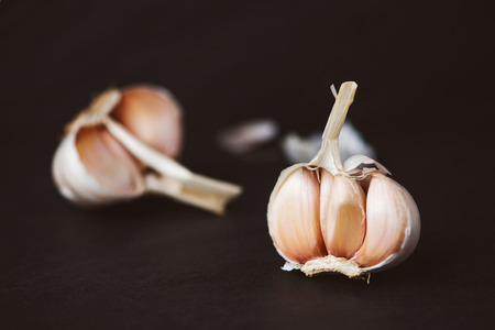 Aromatic garlic parts close up on dark black background, shallow depth of field, selective focus, front focus, macro. Organic medicine to prevent heart deseases. Aromatic appetizer. Fresh seasoning. Healthy lifestyle concept.