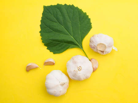 Top view of herbs, fresh white garlic and green leaves on yellow background.