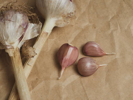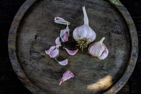 Rustic style garlic on vintage wooden background. Fresh young peeled purple garlic. Top view.