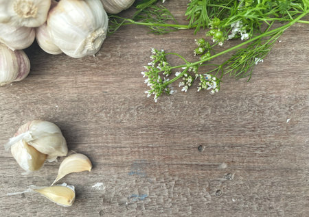 Seasoned Garlic and Herbs for Delicious Home Cooking. Fresh garlic and a variety of aromatic herbs are beautifully arranged on a wooden table, evoking the natural flavors and fragrances.