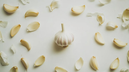 A fresh garlic bulb surrounded by scattered cloves on a light background, showcasing its natural beauty and culinary importance in cooking. Perfect for food-related themes.