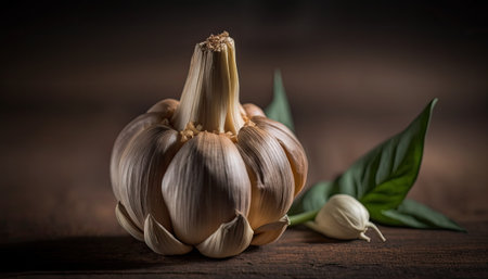fresh garlic bulbs sit elegantly on a rustic wood table, showcasing their papery white skin and vibrant green shoots, perfect for adding flavor to various culinary dishes, from savory sauces to aromatic soups, in a warm and inviting kitchen setting. ai generated