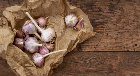 Garlic in paper packaging on old wooden table