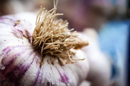 close up of fresh raw garlic in a market