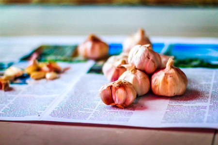 White garlic on old newspaper, collected and carefully chosen for cooking