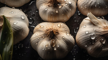 AI Generated. Fresh garlic bulbs with green stems on dark background