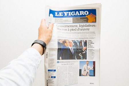 PARIS, FRANCE - MAY 10, 2017: Man holding Le Figaro newspaper front page against white background with the picture of the newly elected French president Emmanuel Macron, the 8th President of France