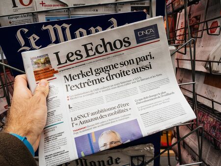 PARIS, FRANCE - SEP 25, 2017: Man buying latest Les Echos newspaper with news about Angela Merkel winner after election in Germany for the Chancellor of Germany, the head of the federal government