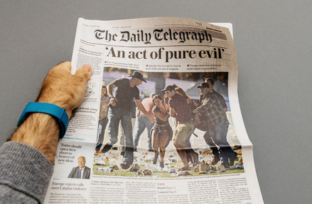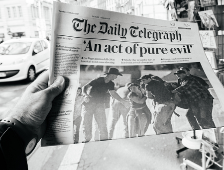 PARIS, FRANCE - OCT 3, 2017: Man holding The Daily Telegraph newspaper cover with socking title Pure Evil and photo after Las Vegas Strip shooting in United States