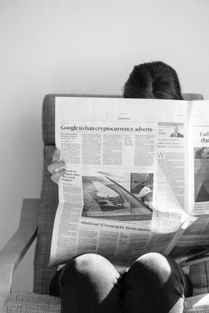 Paris, France - Mar 16, 2018: Young business woman reading Financial Times newsletter with main article Google to ban cryptocurrency advertising